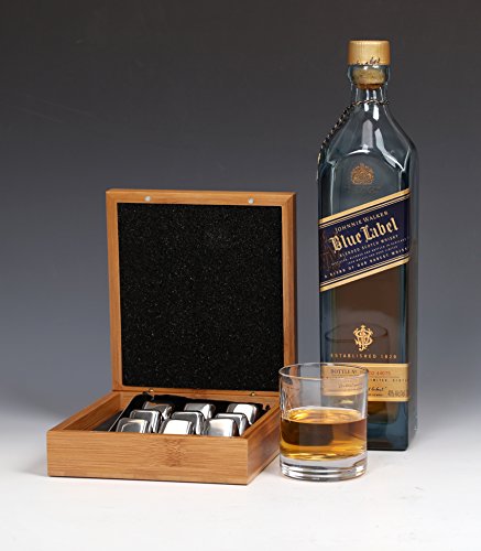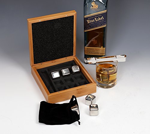-. Title : Whiskey Stones, PERSONALIZED Bamboo Case, 9 Stainless Steel Cubes, Tongs, Velvet Pouch