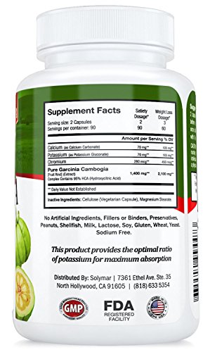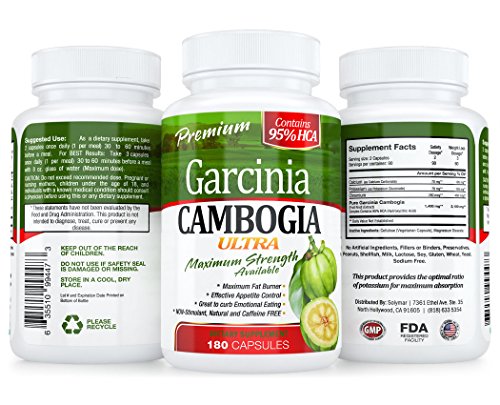 -. Binding : Health and Beauty -. Brand : Garcinia ULTRA -. Color : white -. EAN : 0635510994473 -. Feature : 100% NATURAL and SAFE Garcinia Cambogia. Lose Up to 15+ Pounds a Month.* / ** 95% HCA SO STRONG THAT IT HAS 2,000 mg as MAXIMUM DOSE per DAY, NO NEED FOR 3,000 mg ANYMORE. Great for EMOTIONAL EATERS and MIDNIGHT SNACKERS. BELLY Fat Reduction for a Smaller Waistline* / BEST/STRONGEST GARCINIA *COMPLEX FORMULA* containing the MAXIMUM 95% HCA POTENCY AVAILABLE in the Market Right Now - That means WEIGHT LOSS with Least Effort due to HIGHEST HCA Concentration / SUPPRESSES APPETITE Appetite and STOPS EXCESSIVE Fat Production Naturally.* / Non Stimulant - CAFFEINE Free. SPEED UP METABOLISM - Metabolism BOOSTER Increases Fat and Energy Burning* -. IsAdultProduct : 0 -. Label : Solymar -. LegalDisclaimer : CAUTION: Do not exceed recommended dose (maximum 2,000 mg per day). Pregnant or nursing mothers and children under 18 years old and individuals with a known medical condition should consult a physician before taken this or any other dietary supplement. -. Manufacturer : Solymar -. PackageQuantity : 1 -. ProductGroup : Health and Beauty -. ProductTypeName : HEALTH_PERSONAL_CARE -. Publisher : Solymar -. Studio : Solymar -. Title : ** 95% HCA 180 Caps. GARCINIA CAMBOGIA ULTRA ** 1 BOTTLE = 180 Caps. = 3 Months UNINTERRUPTED SUPPLY ** $$ BACK GUARANTEE - 45 DAYS RETURN, FAST SAME DAY SHIPPING ** -. UPC : 635510994473