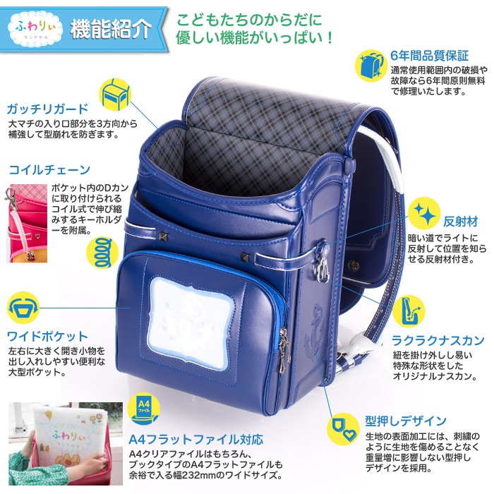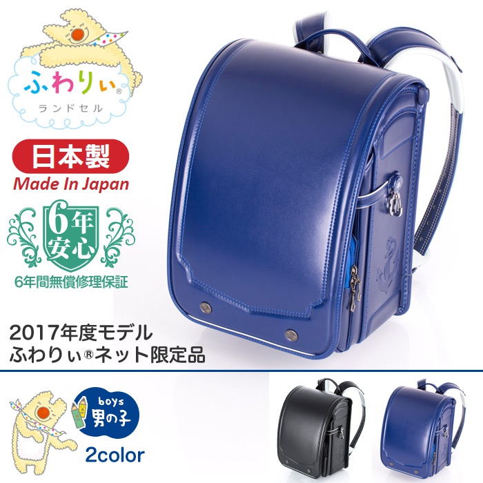 원본상품명: ふわりぃ ランドセル 男の子 2017-2018年度モデル WEB通販限定 オリジナルランドセル 6年保?付きA4フラットファイル??/クラリ?ノF/?量1,000g/ブラック(?)/マリンブル?(?)の2色(送料無料/沖?除く)
