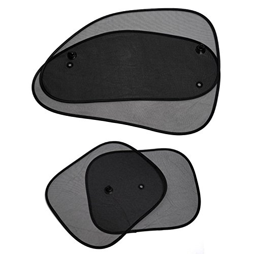 -. Feature : PROTECTION FROM UV RAYS: Car window sun shades are a must have item for the summer time, especially if you live in an area where temperatures are very high. These easy-to-apply Car Window Sun Shades eliminate 97% of Harmful UV Rays and have UPF 30+ Sun Protection, protecting the contents of your vehicle including children, baby, pets, goods and valuables. / CLEAR VIEW: Dual layered manufacturing provides maximum protection against the UV and glare, while maintaining CLEAR CUT VISIBILITY ON THE COUNTRY VIEW. So you know kids in the back seat wouldn't complain about not being able to see the outside either. / SIMPLE TO USE: With pre-attached suction cups, no worry about losing any more, also ensuring the sun shade stay in place firmly. Kids and passengers won't suffer from the sun's rays so you can enjoy the ride without sun shining in their eyes. / COMPACT: When it's not sunny, simply twist the shades back into small circular disks, makes it small enough to easily store in any car storage compartment or your traveling bag. You can easily twist, flip and fold the shade into a compact size. / 2 x Bigger Size: 65*38cm(25*15 inches); 2 x Small Size: 44*36cm(17*14 inches)