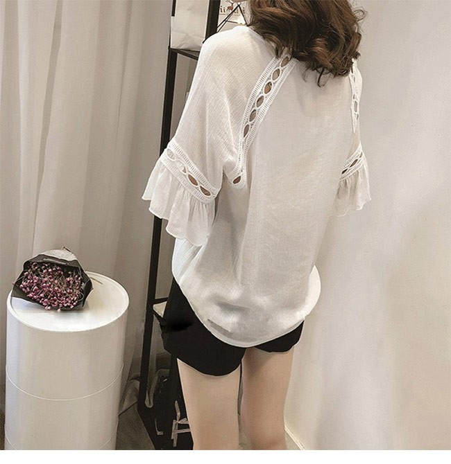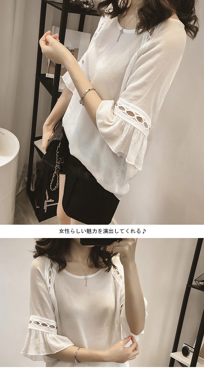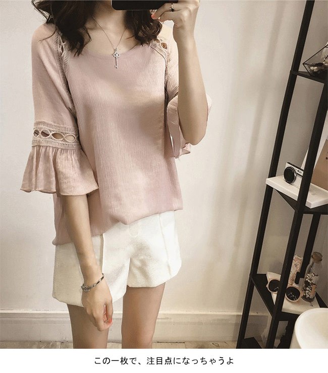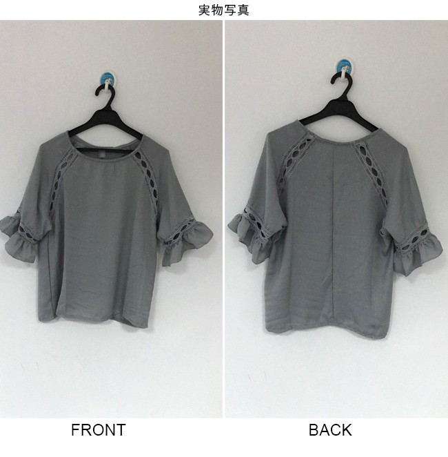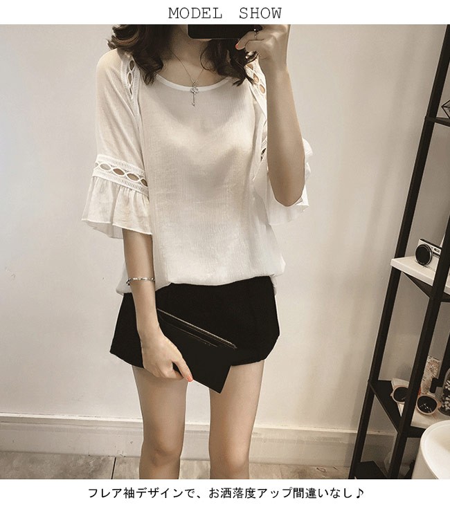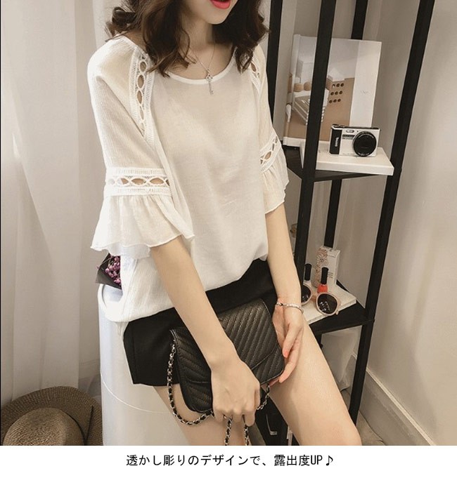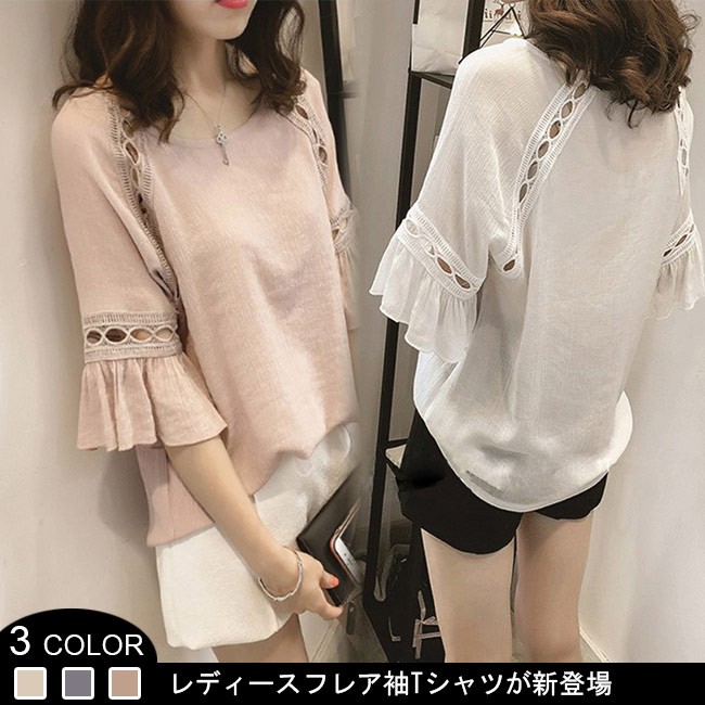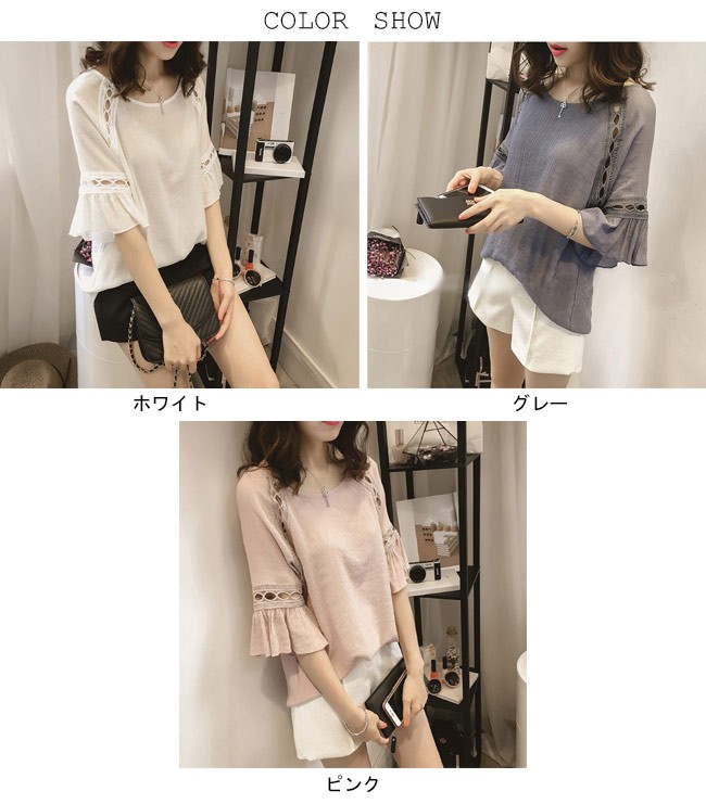 レディースフレア袖Tシャツが新登場フレア袖デザインで、お洒落度アップ間違いなし♪女性らしい魅力を演出してくれる♪透かし彫りのデザインで、露出度UP♪この一枚で、注目点になっちゃうよカラー ホワイト グレー ピンクサイズ(cm) M L XL 2XL 3XL 4XLM バスト:96 肩幅:36 袖丈:35 総丈:52L バスト:98 肩幅:36 袖丈:36 総丈:56XL バスト:104 肩幅:37 袖丈:39 総丈:562XL バスト:109 肩幅:39 袖丈:38 総丈:593XL バスト:112 肩幅:40 袖丈:40 総丈:604XL バスト:114 肩幅:43 袖丈:40 総丈:60ご注意:※サイズは平置きサイズです。素人採寸ですので、若干の誤差がございます、ご了承ください。素材 ポリエステル【送料無料】Tシャツ ブラウス 5分袖 クルーネック フレア袖 透かし彫り 無地 薄手 ゆったり 体型カバー お洒落 女性用 レディーストップス 夏