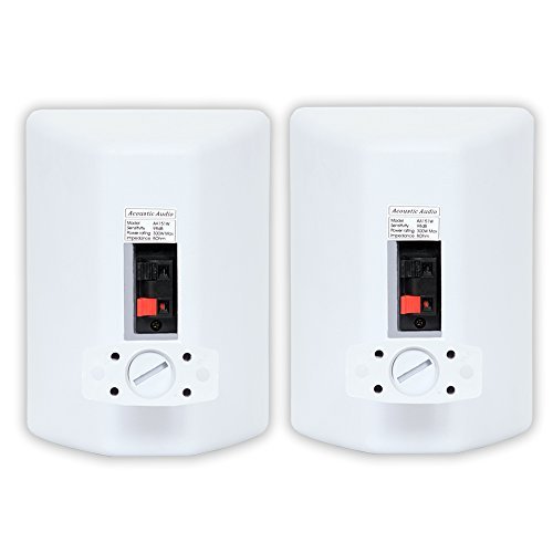 -. Feature : Acoustic Audio 151W indoor or outdoor white weather resistant speakers, recommended power is 20-600 watts per pair, frequency response is 37Hz-20 kHz, efficiency is 98dB, 8ohm / 4" silver CD woofers with butyl rubber surrounds, .5" ferro fluid cooled mylar dome tweeters, weather resistant design, mounting brackets and hardware included / Quick release sP.R.Ing loaded wire terminals, heavy duty ABS construction sealed cabinets, each speaker size (HxWxD) is 7.5"x5.5"x5", designed and engineered in the USA, full instructions included / Use for surround sound, home theater, multiple room systems, industrial sound, bookshelf, bathrooms, kitchens, car audio, marine audio, pools, spas, yards, decks / This listing and P.R.Ice is for 2 pair / 4 indoor or outdoor speakers