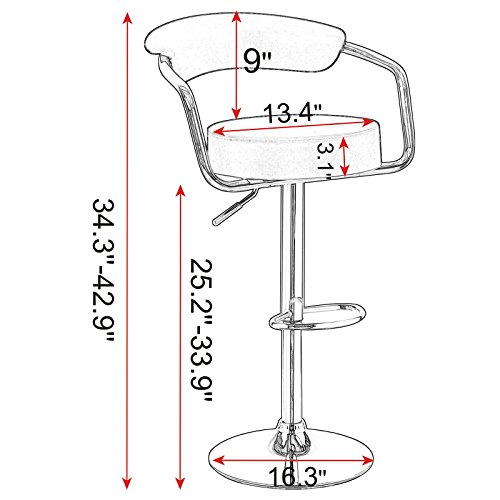 -. Feature : Material: chrome steel/synthetic leather; Seating surface: padded synthetic leather / 360 degree rotation,height adjustable / Quantity: set of 2 / High quality polished chrome frame with footrest / Size: Adjustable seat height: 34.3-42.9in Total height: 33-41.3in Seating area:13.4x13.4in
