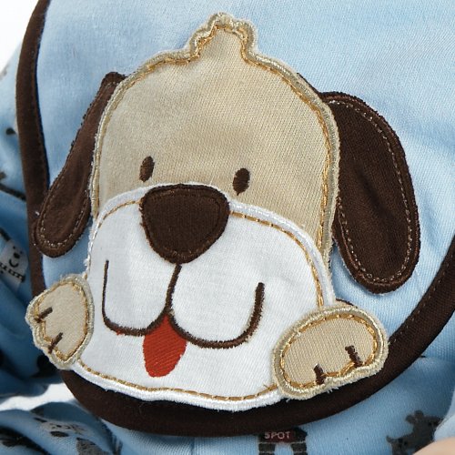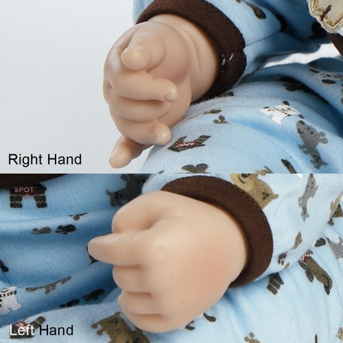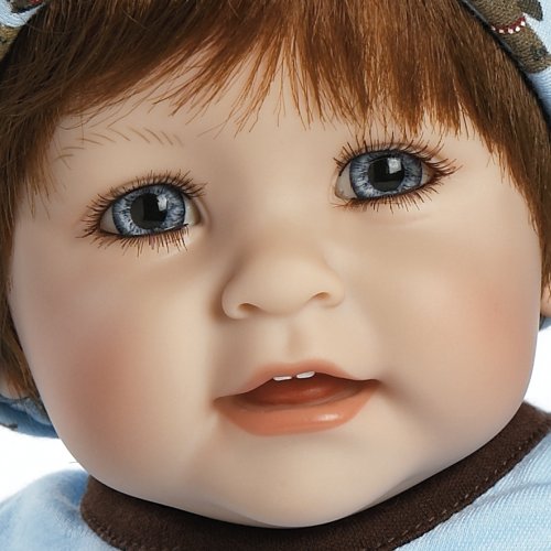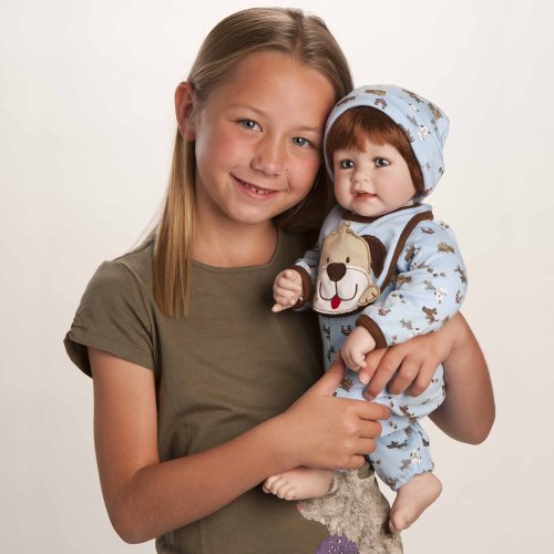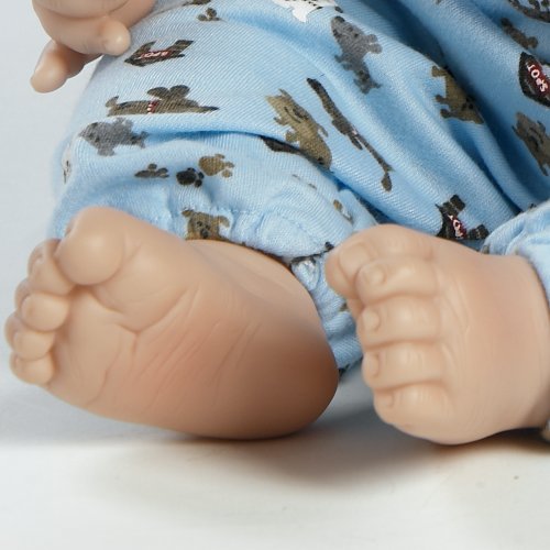 - Feature : So cute in his all-in-one comfy jersey knit puppy print PJ?s, with a blue bib trimmed in brown with the happy puppy on the front / Beautiful hand set blue eyes, hand painted details and hand applied eyelashes / Shiny brown hair / Baby powder scented high quality vinyl toddler doll for hours of playtime fun / 20" from head to toe with a weighted body to feel like real baby complete with diaper