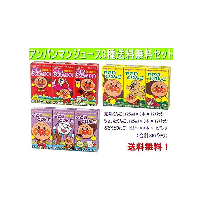 원본상품명: 明治 アンパンマン3種セットA「ぶどう、やさい、りんご」125ml×3本×36パック