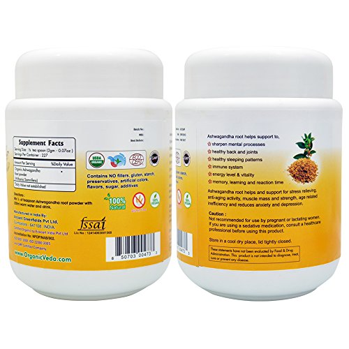 - Feature : ★ ALL NATURAL PREMIUM RAW ORGANIC ASHWAGANDHA ROOT POWDER (Withania Somnifera). Powerful Adaptogenic. High Potency Raw Super Food Supplement. Relieves Stress and Builds Vitality. Enhances Brain Function. / ★ A Famous Traditional Rejuvenating Tonic Herb. Sharpens Mental Processes, Supports Healthy Back and Joints, Helps Memory, Learning and Reaction time. / ★ Promotes Restful Sleep. Increases Energy and Vitality. Promotes Energy, Rejuvenates Body and Mind. Strengthens the Immune System and Supports Body Functions. / ★ GMO-free, Solvent-free. Helps promote stress resistance, calm the mind, and supports relaxation and overall well-being. / ★ USDA Certified Organic, FDA Registered Facility, FDA recommended packaging material. Organically Grown, Harvested and Manufactured by ISO Standard Certified Company! Buy with Confidence!