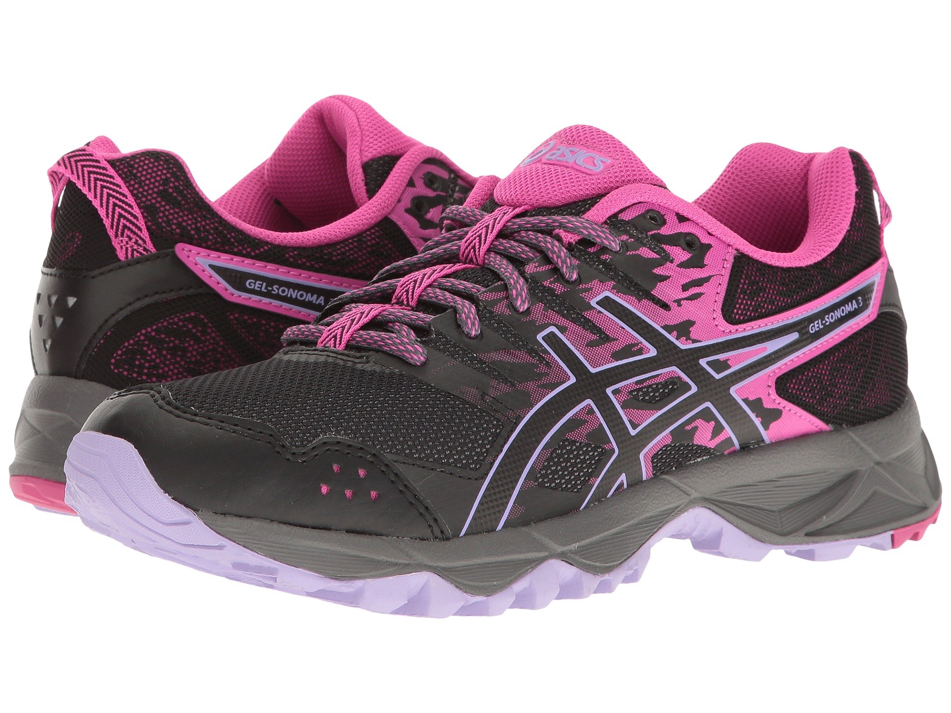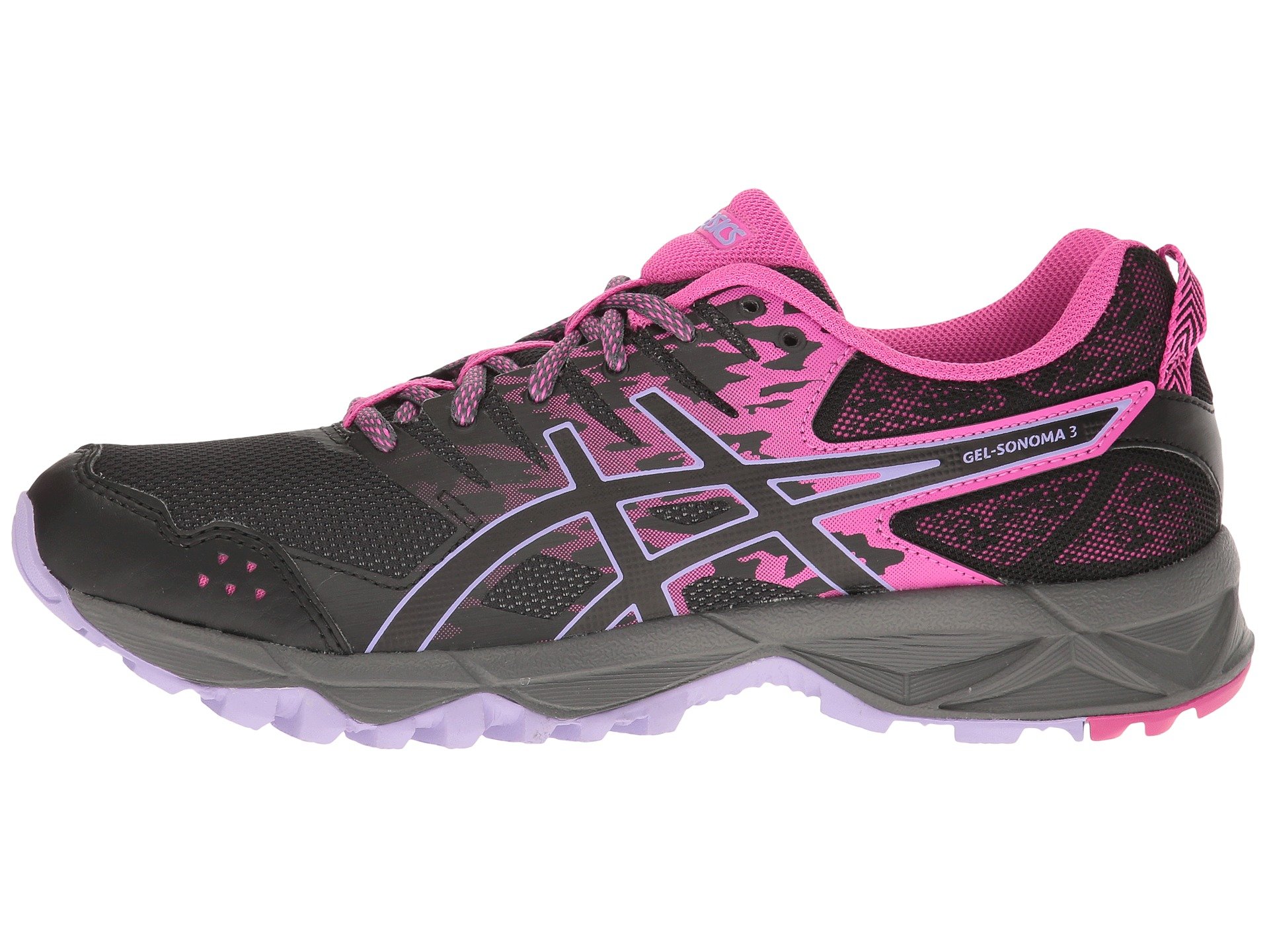 | Product Information SKU: #9011784Break from your typical asphalt training session, and take to the trails in the ASICS? GEL-Sonoma™ 3 running shoe!Predecessor: GEL-Sonoma 2. Support Type: Neutral to underpronation. Cushioning: Lightweight, flexible response. Surface: Trail. Differential: 8 mm.Hardy mesh and synthetic upper materials. Lace-up closure. Padded tongue and collar.Breathable fabric lining offers a great in-shoe feel. Removable textile footbed. SpEVA? midsole material decreases midsole breakdown for long-lasting wear. Rearfoot GEL? cushioning system attenuates impacting shock, allowing for a smooth transition throughout the gait cycle. Heel/Toe: 19 mm/11 mm.Durable AHAR? rubber outsole delivers reliable traction and grip. Trail Specific outsole features reversed lugs that provide uphill and downhill traction on varied terrain.Imported.Product measurements were taken using size 9, width B - Medium. Please note that measurements may vary by size.Weight of footwear is based on a single item, not a pair.Measurements: Weight: 10 oz |