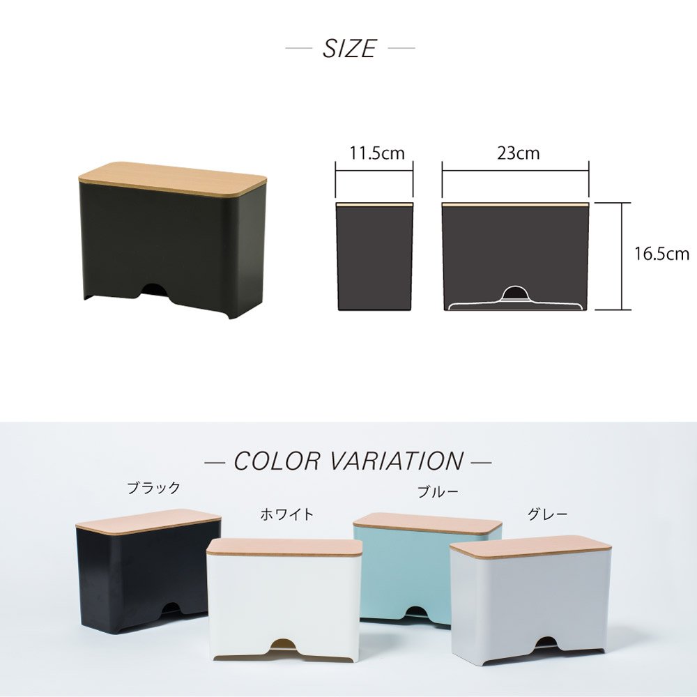 サイズ:W23×D11.5×H16.5cm 素材・材質:ABS樹脂(本体)、ブナ突板MDF(蓋)、シリコン(滑り止め)