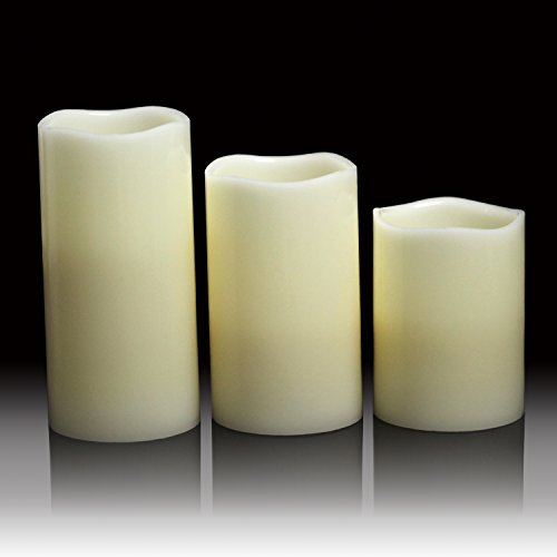 IDEAL SIZE AND BATTERY OPERATED -This is a set of 3 pieces of battery operated glow candles, Each sets come with 4", 5", 6" Tall and 3" Wide, Each glow candles requires 3 AAA batteries. Batteries are NOT included.