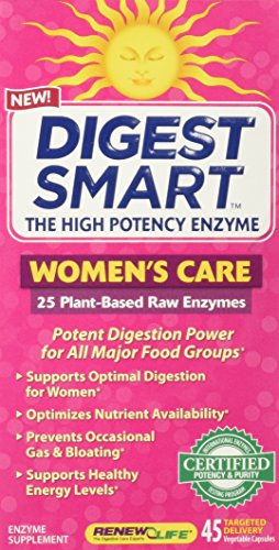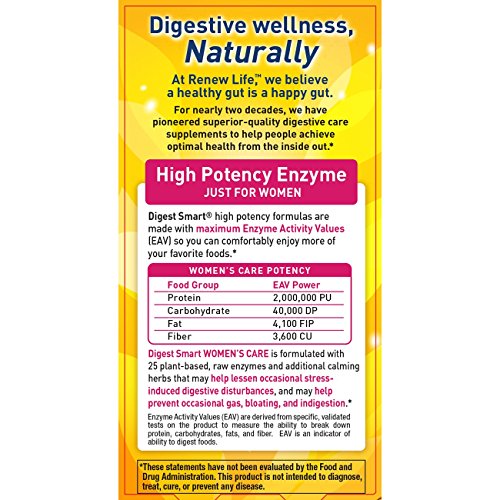 Digest Smart Women's Care is a broad-spectrum digestive enzyme formulated with 25 plant-based, raw enzymes to help break down protein, carbohydrates, fats, and fiber. This formula may help prevent occasional gas, bloating, and indigestion, and may help lessen occasional stress-induced digestive disturbances. Digest Smart high-potency formulas are made with maximum Enzyme Activity Values so you can comfortably enjoy more of your favorite foods. These statements have not been evaluated by the Food and Drug Administration. This product is not intended to diagnose, treat, cure, or prevent any disease.Feature