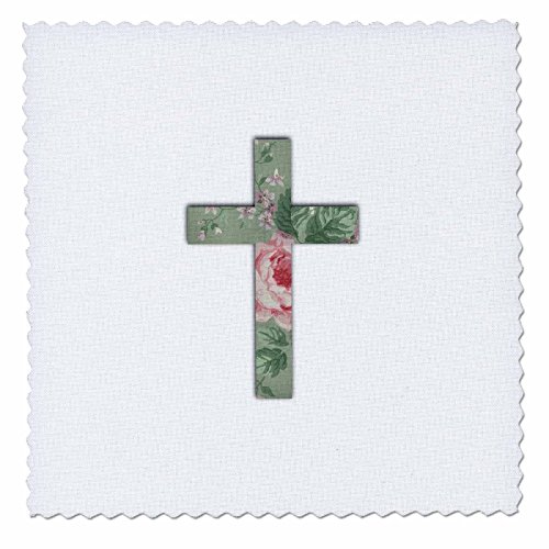 3dRose qs_185480_2 Girly Floral Christian Cross Sage Green Rose Flower Pattern Crucifix Quilt Square, 6 by 6"