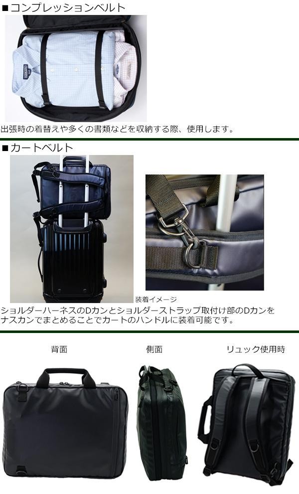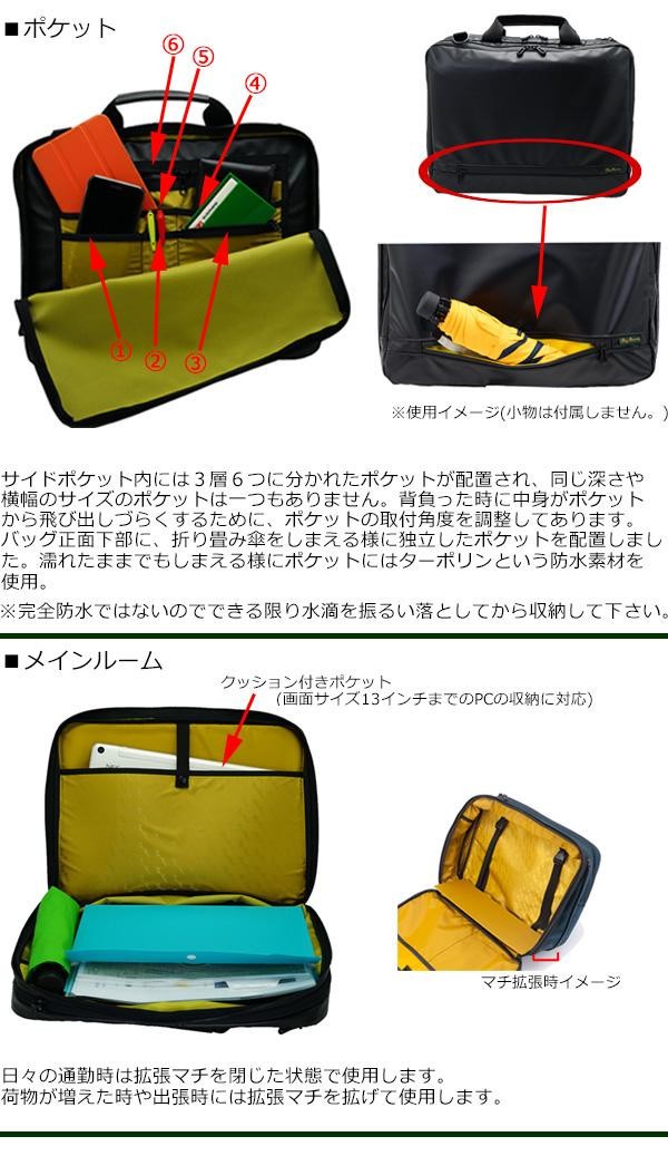 | 雨の日でも中のモノが濡れにくいビジネスバッグです。正面側のメインルームにはクッション付きポケットを配置し、13インチまでのPCの収納に対応しています。メインルームのマチは通常は7cmですが、最大13cmの厚みまで拡がりますので1、2泊の出張にも対応できます。ショルダーハーネスを調整することでカートへの装着が可能になり、日々の通勤から出張までオンタイムには毎日活躍!! |