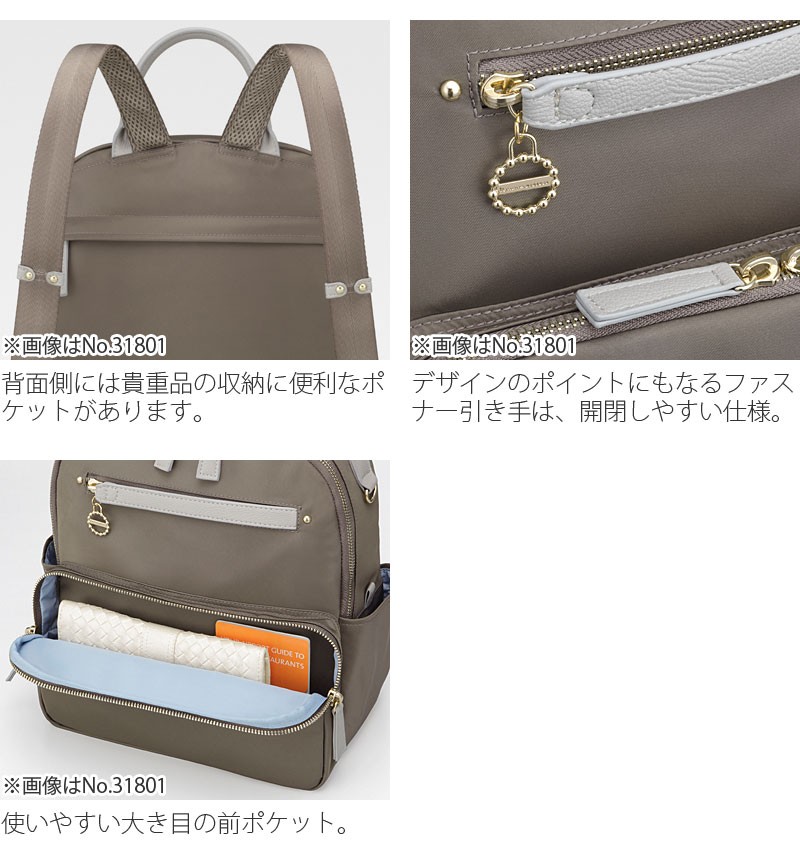 前面…ファスナーポケット×1、マチ付きファスナーポケット×1(中にオープンポケット×1) 側面…オープンポケット×2 背面…ファスナーポケット×1 内側…ファスナーポケット×1、オープンポケット×2、ペンさし×1、ボトルホルダー×1 付属…ミニポーチ×1 |