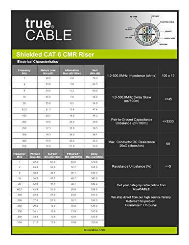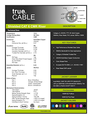 Cat6 Shielded Riser (CMR), 500ft, Blue, Solid Bare Copper Bulk Ethernet Cable, 550MHz, ETL Listed, 23AWG, Overall Foil Shield (FTP), trueCABLE