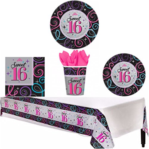 -. Title : Sweet 16 Sixteen Birthday Party Supplies Pack for 8 Guests - Lunch Plates, Dessert Plates, Lunch Napkins, Cups, and a Table Cover