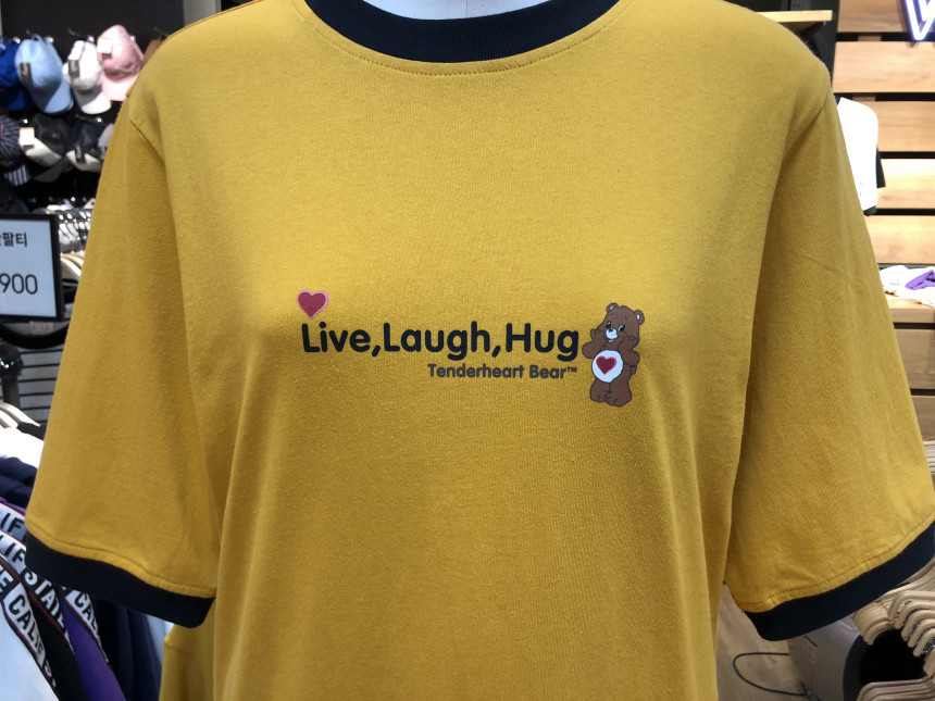 기쁨을 찾게 해주는 케어베어의 메세지를 왼쪽 가슴에