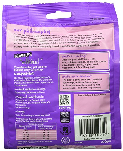 -. Binding : Misc. -. Brand : Barking Heads -. EAN : 5060189111657 -. Feature : Belohnungsleckerlis für Welpen - Huhn und Lachs / 100 % natürliche Zutaten / Handgemachte Welpenleckerlis für starke Knochen und Zähne - perfekt fürs Training / Hergestellt in Europa, nur mit den besten Zutaten / Ohne synthetische Konservierungs-, Aroma- und Farbstoffe -. Label : Pet Food UK -. Manufacturer : Pet Food UK -. Model : BBMK -. MPN : BBMK -. PackageQuantity : 1 -. PartNumber : BBMK -. ProductGroup : Pet Products -. ProductTypeName : PET_SUPPLIES -. Publisher : Pet Food UK -. Studio : Pet Food UK -. Title : Barking Heads BBMK HundeHundeleckerli & Snacks Bailey Bites Milkies, 200 g