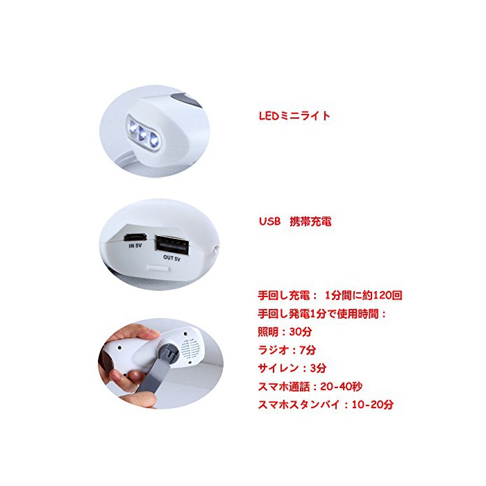 【2종류의 전원 대응】①수동식 충전:비상시에 전원이 없어도 언제라도 어디에서라도 사용 가능합니다.②USB충전:부속 USB-microUSB변환 케이블을 사용하고, PC 등의 USB단자부터 충전으로 옵니다.