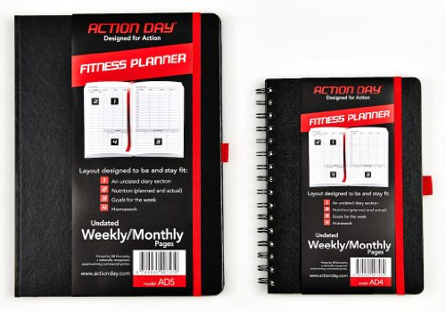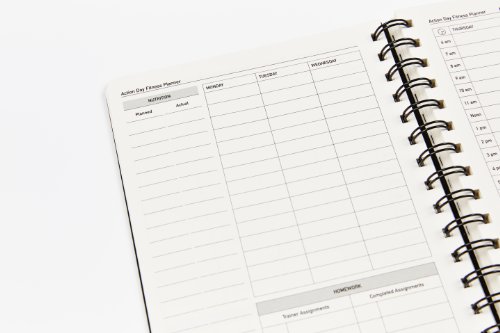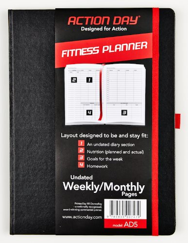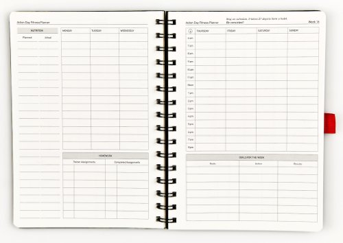Studio : Action Day Publisher : Action Day Binding : Office Product Product Description Unique undated weekly page layout with blocks for appointments, nutrition (planned and actual), goals and homework (trainer assignments and completed assignments). The planner is undated, 52 weeks. Action Day planner also includes an owner information page, 19 page teaching tool to equip you in your fitness journey, month at-a-glance pages for the year and 29 pages of journal to track your journey to the new you! This Action Day Fitness planner is spiral bound and has a hard cover with rounded corners, an elastic pen loop, acid free paper, an elastic closure, printed by RR Donnelley, a certified and award-winning printer. Action Day's layouts are Designed for Action ¨ - that makes it easier for you to Plan and Get Things Done. 0