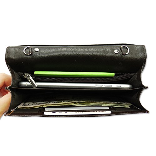- Feature : 1. Material: Pure handmade with genuine leather inside, Outside: Premium Synthetic leather imported / 2. can fit most cell phones (size up to: 6.3 inches) even with a silicone protector case on it, including: Apple iPhone 6 Plus, Iphone 6 4.7", 6, 5S 5C 5 4S 4, Samsung Galaxy S6, S5 S4 S3, Google Nexus 5, LG G2, HTC One M7, Sony Xperia Z, Moto X, Moto G, Droid Razr. / 3. Wallet: 1 apartment for phone, 9 Card Slots, 1 ID window, 1 vertical storage sleeve for cash, 1 chained pocket for coins. An Fabulous convenient size to hold all your essentials in one small packet. / 4. An outside small pocket makes easy access for essentials, like lipstick, mirrors. / 5. Measures Height: 4" Length: 7.2" Depth: 1.5",25" shoulder drop& you can grip this cute wallet as a handbag or CROSSBODY CLUTCH- PERFECT FOR A DAY OR NIGHT OUT-