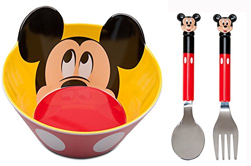 Studio : Disney Publisher : Disney Product Description Oh Boy!! Meal time always becomes more exciting with Mickey Mouse. His personality is so big, it can not be contained by this colorful melamine bowl and cutlery set. Mickey Mouse's cheery face and signature shorts both add friendly character to this spoon and fork filled with Meal Time Magic. What a great gift from The Happiest Place on Earth All BPA free. Cutlery is stainless steel and plastic. Bowl is melamine. 0