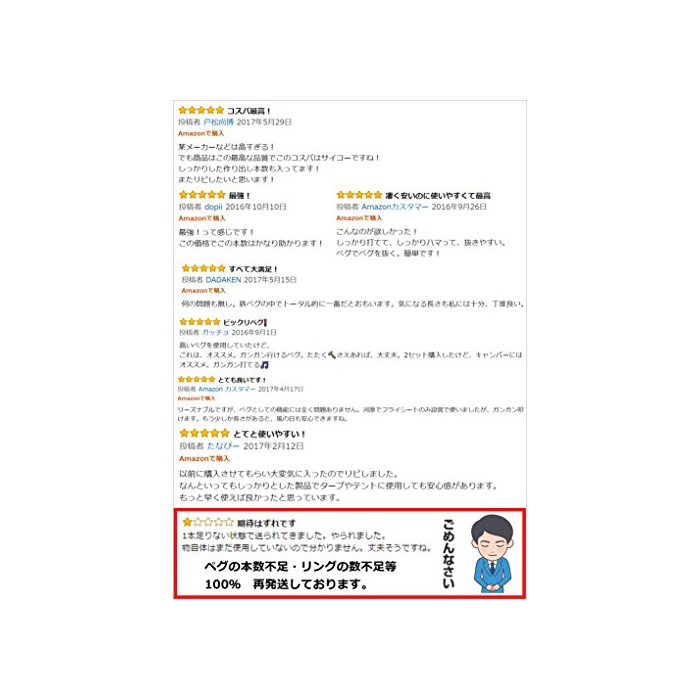 ★이 페그(말뚝)의 디자인은 브랜드품의 페그(말뚝)에 완전히 패해 있습니다만,기능으로는 꽤 뛰어나 있습니다. ①고강도의φ9mm호강에 만들어져 있으므로,부러짐거나 구부러지거나 하지 않습니다. ②딱딱한 지반,초땅의 사이트 라면20cm의 페그(말뚝)로 충분합니다.페그(말뚝)를 15cm정도 45~60°의 각도로 박아 넣으면 어른2명때문에 로프를 인# 장도 빠지는 것은 없습니다.(로프가 끊어집니다) ③이 페그(말뚝)는 조악하지만 조악함으로도 이유가 있ㅂ니다(화상을 보기 해 주시면 이해와 같이)3대로도 제치는 방법이 있습니다. 또한머리 부분이 게시한 부분을 좌우로 두드리면 로프를 연관시키는 위치도 수정에 옵니다.아무리 해도 빠져 없는 경우는 찔렀다혈을 크게 할 필요가 있지만 이 페그(말뚝)는 강렬하게 옆에서 세게 때림 으로 해도 꿈쩍도 하지 않습니다.