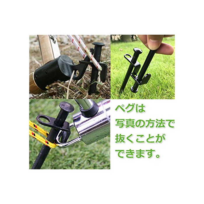 ★페그(말뚝)에 요구되는 요건은 ①해머로 깎아도 부러짐거나 구부러지거나 하지 않는 튼튼함 ②풍력에 견뎌 빠져 없을 필요 최저한의 길이 ③철수가 간단하고 시간 단축 이 생기는 뽑기 쉬운 구조의 3요건입니다. 이 페그(말뚝)는 3요건을 구비한(갖춘) 페그(말뚝)입니다.