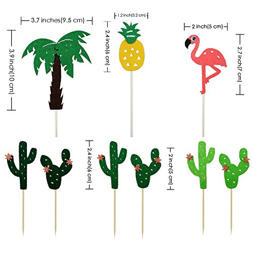 - LUAU HAWAIIAN BEACH PARTY SUPPLIES: Fruit and animal cake toppers includes 4 x pink flamingo cupcake toppers, 2 x yellow pineapple cake picks, 12 x cactus cupcake toppers, 2 x coconut tree cake toppers, a total of 20.