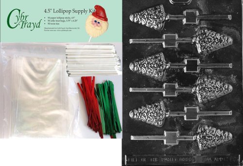 Cybrtrayd 45stK50C-C082 Tree Lolly Christmas Chocolate Mold with Lollipop Kit and Molding Instructions, Small, Includes 50 Lollipop Sticks, 50 Cello Bags, 25 Red and 25 Green Twist Ties