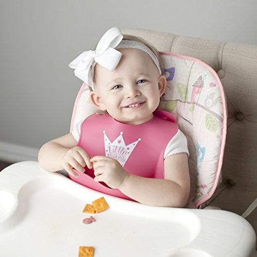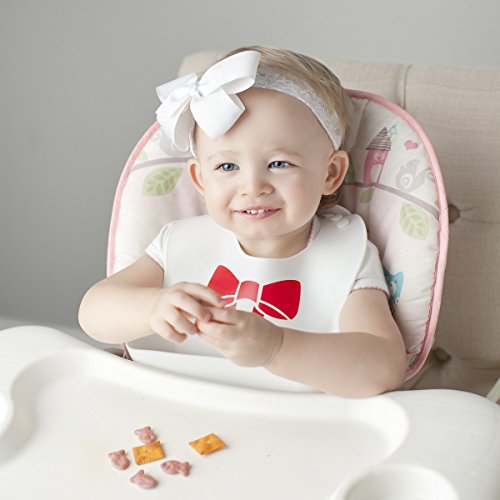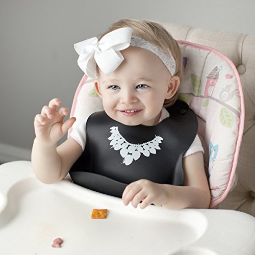 THE EXTRA WIDE CRUMB CATCHER pocket stays open and will keep your child's clothes pristine and stain free.