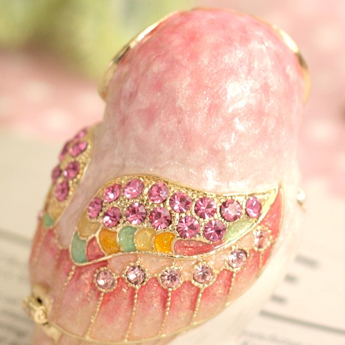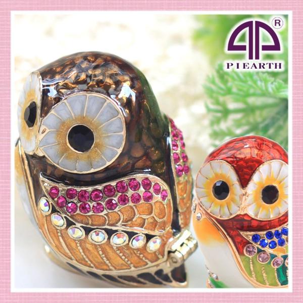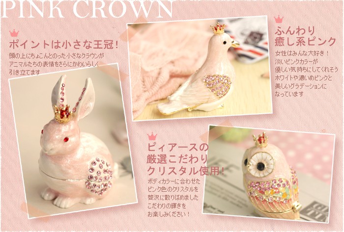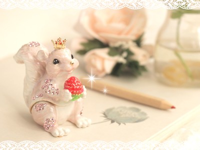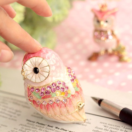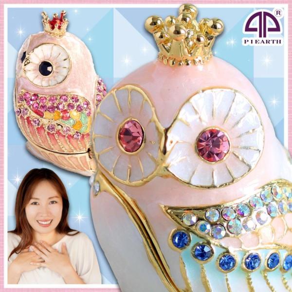 | ジュエリーボックスと言えば、指輪やピアス、ネックレスなどのアクセサリーを入れる引き出し型のケースを思い浮かべる方が多いかもしれません。 ピィアースのジュエリーボックスは、動物や花などをモチーフに作られ、合金製でずっしりとした重さがあります。また高品質のクリスタルガラスを贅沢に使用。まるでジュエリーボックスそのものが宝石のような、高級感溢れる仕上がりです。 小物入れとしても使えるように開閉口には磁石が取り付けてあり、アクセサリーなどなくしやすいアイテムの収納ができます。キラキラと美しく輝く宝石箱は、そのまま飾って楽しめるインテリア雑貨として多くの方に愛されています。 国内トップクラスのジュエリーボックスメーカーであるピィアースは、2004年ごろから本格的に宝石箱の製造を始め、現在のジュエリーボックスはなんと300種類以上。大規模展示会でもご好評いただいており、全国有名百貨店でも販売されています。 自社工場でひとつひとつ丁寧に手作りし、原型作成、研磨、加工、着色、小さなクリスタルガラスの取り付けなども全て手作業で行われるこだわりのハンドメイド品。完成後は厳しい検品の後、丁寧に梱包作業をしお客様にお届けしております。 ピィアース商品は、全国有名百貨店および全国有名宝石店チェーンにてお取り扱いいただいている高品質商品です。 ★自分へのご褒美に…コレクションして並べて飾ると、さらにかわいらしさUP! ★恋人へのプレゼント…中にアクセサリーを入れて、サプライズな贈り物として ★家族への感謝ギフト…お母さんや姉妹へ、日頃のありがとうの気持ちを込めて ★誕生日プレゼント…お友達の喜ぶ顔が見たいから、いつもと違うキラキラギフトを ★小さな女の子へ…まるでお姫様が使っているようなキラキラ宝石箱は女の子の憧れ! |