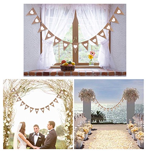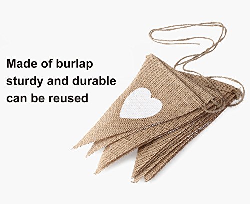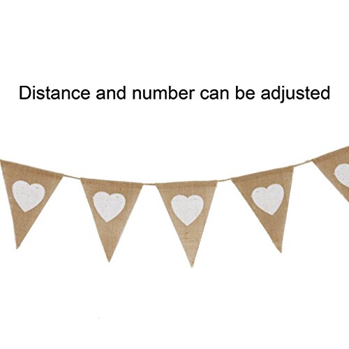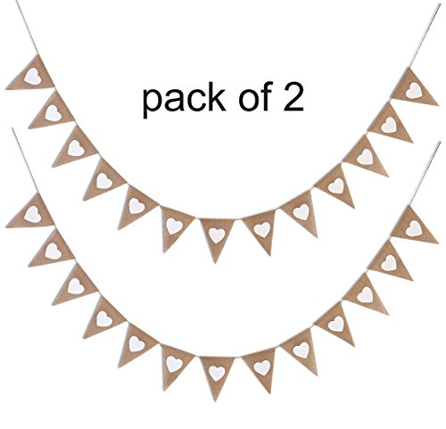 -. Feature : Made of 100% natural jute, great quality that does not fray. / Pack of 2, each banner with 13 pieces Triangle flags and 10 feet long, each flag is 6.7 inch high and 5 inch wide. / The flag can be removed to adjust its numbers and distance. / The flag is painted with love heart, great for kids party, wedding, birthday, baby shower, country party, celebrations and decorations of any occasion. / After everyone left your party, you can set this banner aside to keep it for the future.
