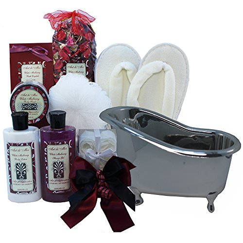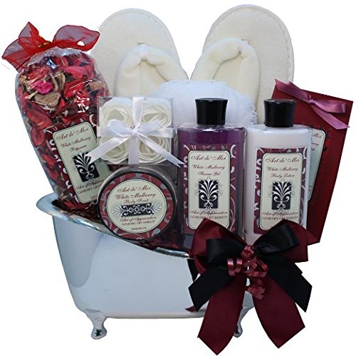-. Feature : Send her on a special spa retreat with the refreshing sent of White Mulberry. / Presented in a whimsical metal wire bathtub, it's filled Spa Slippers, Aromatic Potpourri, and our luxurious line of Art de' Moi spa products. / Each gift is hand crafted with attention to detail, shrink wrapped, then tied with a bow for presentation, ready for gift giving. / Add a personalized gift card message by selecting "GIFT" during checkout.