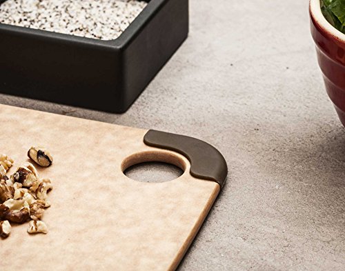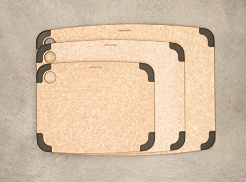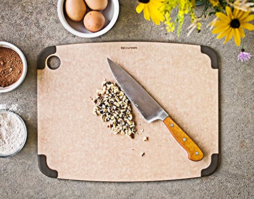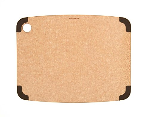 - 14.5 x 11.25 inch wood fiber composite cutting board, natural color, removable silicone corners; dual-sided cutting surface