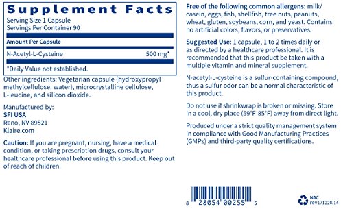 N-Acetyl-L-Cysteine 90 caps Dietary Supplement ProThera products may only be purchased by Health Care Professionals. Patients who want to buy ProThera products may obtain them from their Health Care Professional. N-acetyl-L-cysteine is a sulfur-containing compound thus a sulfur odor can be a normal characteristic of this product. Supplement Facts Serving Size 1 Capsule Servings Per Container 90 Amount Per Capsule N-Acetyl-L-Cysteine USP 500 mg Other ingredients: Vegetarian capsule (hydroxypropyl methylcellulose water) cellulose L-leucine and silicon dioxide. Free of the following common allergens: milk/casein eggs fish shellfish tree nuts peanuts wheat/gluten corn yeast and soybeans. Contains no artificial colors flavors or preservatives. Suggested Use: 1 to 2 capsules daily. It is recommended that this product be taken with a multiple vitamin and mineral supplement. Do not use if full-bottle shrinkwrap is broken or missing. Store in a cool dry place (59 F-85 F) away from direct light. KEEP OUT OF REACH OF CHILDREN. This product was made in a GMP and ISO 9001:2008 registered facility.Feature