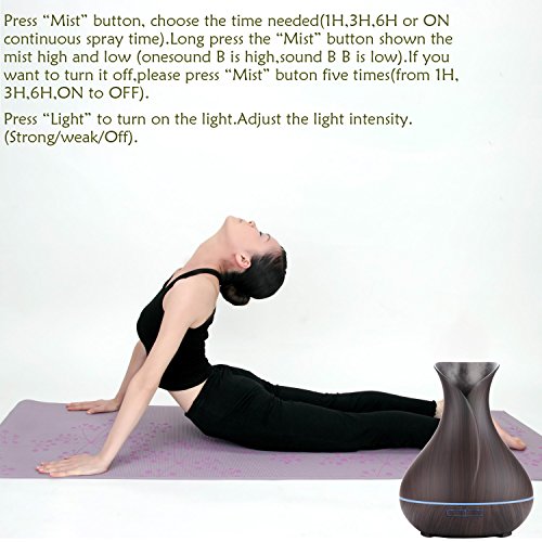 Large Capacity and Waterless Auto Off: The diffuser can hold up to 400ml of water, works well in a large space like your living room without keeping refilling it. With waterless auto-off function,when the water stored is off, the diffuser will automatically turn off in case you do not notice it, reliable and safe use.