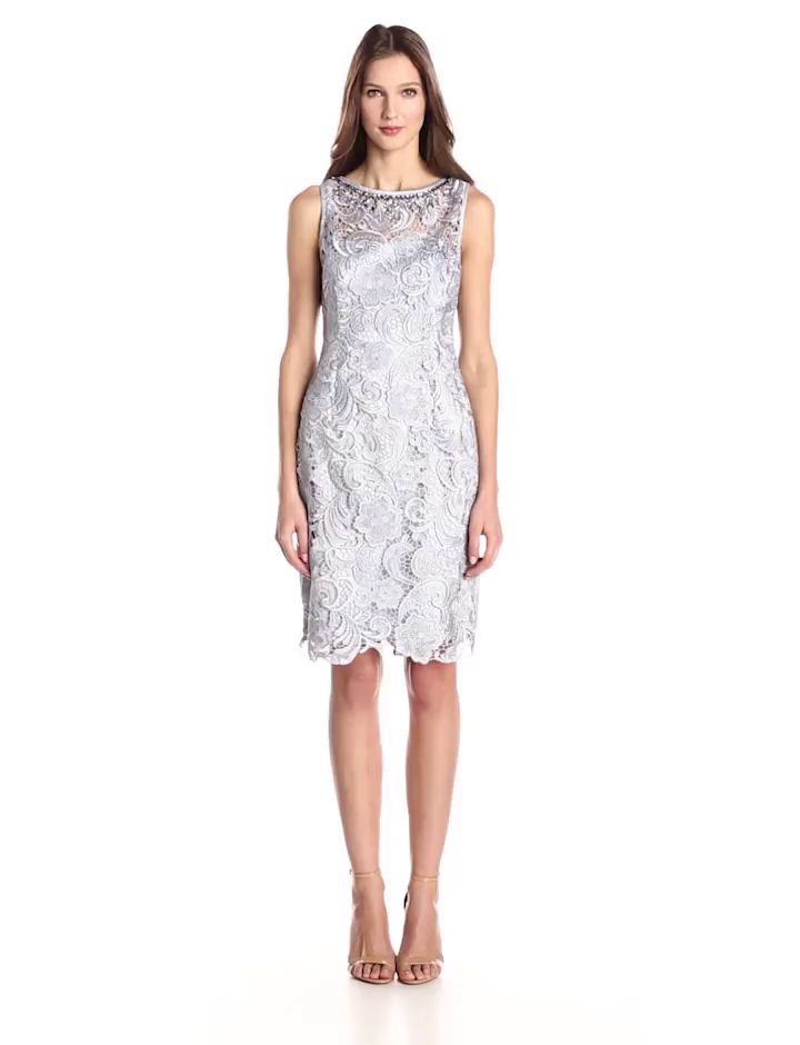 Sleeveless design with a round neckline. Keyhole button closure has a concealed zipper in the back. Concealed zipper in the back. Scalloped hemline. Lace: 100% polyester;Feature