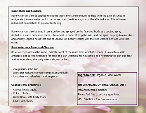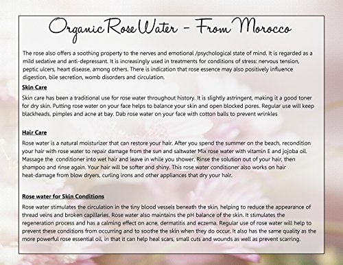 -. Feature : Our 100% Moroccan Rosewater is also edible. It is widely used in North African countries such as Morocco, for desserts and drinks. It adds great and subtle flavor to your favorite sweets. / ✔ FOR SKIN - It is slightly astringent, making it a good toner for dry skin. Putting rose water on your face helps to balance your skin and open blocked pores. Regular use will keep blackheads, pimples and acne at bay. Dab rose water on your face with cotton balls to prevent wrinkles. Rose water stimulates the circulation in the tiny blood vessels beneath the skin, helping to reduce the appearance of thread veins and broken capillaries. / ✔ FOR HAIR - Rose water is a natural moisturizer that can restore your hair. After you spend the summer on the beach, recondition your hair with rose water to repair damage from the sun and saltwater Mix rose water with vitamin E and jojoba oil. Massage the conditioner into wet hair and leave in for 3 minutes. Then wash as usual. Your hair will be softer and shiny. This rose water also works on hair heat-damage from blow dryers, curling irons & other appliances that dry your hair. / ✔ GENTLE - Suitable for all skin types, including sensitive and irritated skin. Rejuvenating, stimulating, and harmonizing. / ✔ MULTIPLE USES - Rose water possesses the sweet, delicate scent of the roses from which it is made. It is a natural mild antiseptic and is recommended for acne and skin irritation, for nourishing and hydrating the skin and face, and for nourishing the body after a shower or bath.