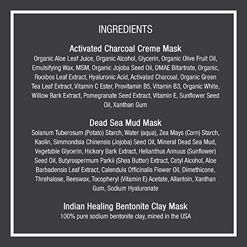 -. Feature : This NEW beauty gift set contains 1 each of Dead Sea Mud Mask 8.8 oz, Activated Charcoal Mask 8.8 oz, and Indian Healing Bentonite Clay Mask 8.8 oz. / Dead Sea Mud Mask deeply CLEANSES your face and skin with mineral-infused mud, derived from the Dead Sea. / Activated Charcoal Mask for face and body HYDRATES with deep skin purification and cleansing. / Indian Healing Bentonite Clay HEALS skin by actively seeking toxins and impurities. / Makes a unique Christmas gift or stocking stuffer.