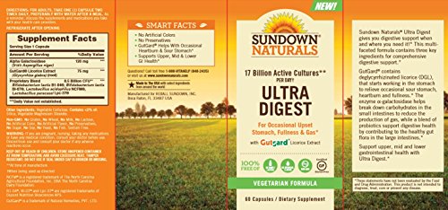ReleaseDate : 2016-02-27 Studio : NBTY.inc - US Nutrition,inc. Publisher : NBTY.inc - US Nutrition,inc. Binding : Health and Beauty Product Description Sundown Naturals Ultra Digest gives you important digestive support when and where you need it! Ultra Digest supports your gastrointestinal system in the upper, mid, and lower regions. Our multi-faceted formula contains enzymes and probiotics to help with occasional upset stomach, fullness gas. 0