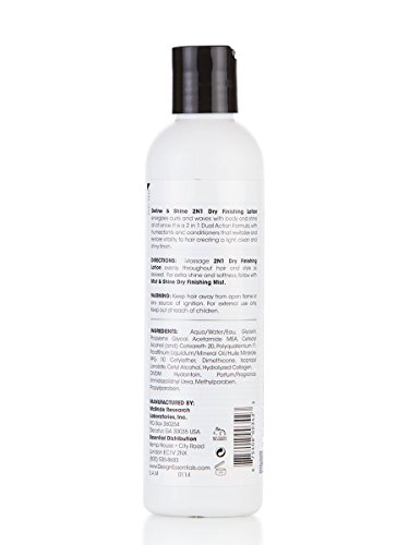ReleaseDate : 2017-02-01 Studio : Design Essentials Publisher : Design Essentials Binding : Health and Beauty Product Description Rejuvenate Waves, Curls, Textured Styles: Wave By Design Define Shine 2-N-1 Dry Finishing Lotion promises to do two important things - RESTORE softness and vitality to hair creating a light, clean, and shiny finish, and REVITALIZE any curl type (permanent waves, textured styles, and natural or dry curls) by imparting body and shine without product build-up.