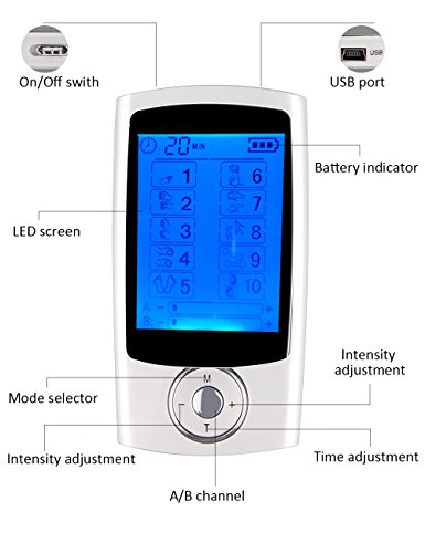 - VERSATILE AND EASY TO USE: 2 output with 10modes, 4pads on the body at the same time Easily adjustable settings, animated display on LCD screen: massage mode, intensity, treatment time. Built in timer from 10 to 60 minutes,default timer: 20 minutes. When time is due, it is automatically shut off.