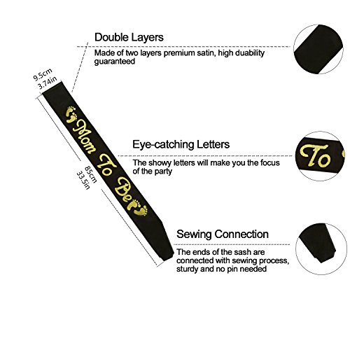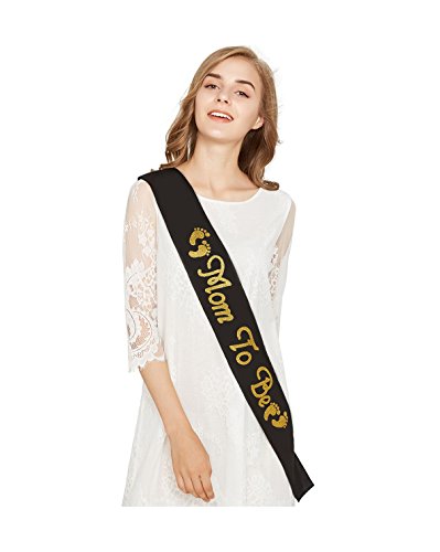 -. Feature : Celebrate she is going to be a mother ,Everyone knows you're the mom to be. / Made of premium satin,size: The sash is a one size fits all. One side measures approximately 85cm(L)* 9.5cm (W).Sash was sewn ,No pin needed / This beautiful "Mom to Be" sash is sparkling with gold glitter letters and pictures. It's cute, durable,reuseable,take photos to share with your family members and friends ,after several years ,it will be full of memory . / Our beautiful "Mom to Be" sash looks great with whatever you wear,She'll stand out in the crowd with this beautiful baby shower favor. / We stand by our sashes with a 100% money back guarantee. If this party sash does not make you and your loved ones smile, then your money back.