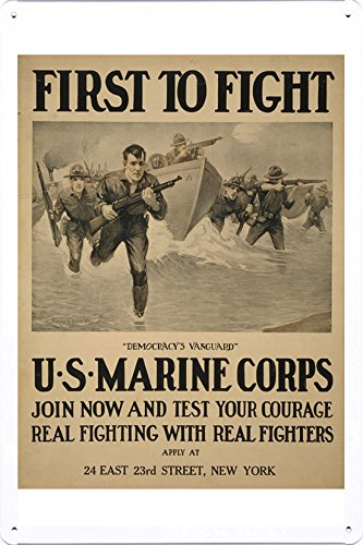 World War I One Tin Sign Metal Poster (reproduction) of First to fight - "Democracy's vanguard" U.S. Marine Corps - Join now and test your courage - Real fighting with real fighters /
