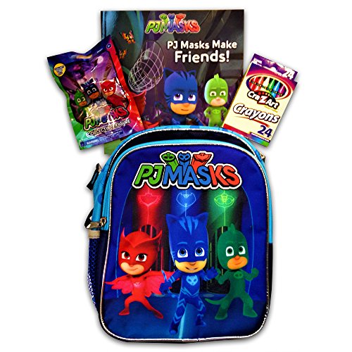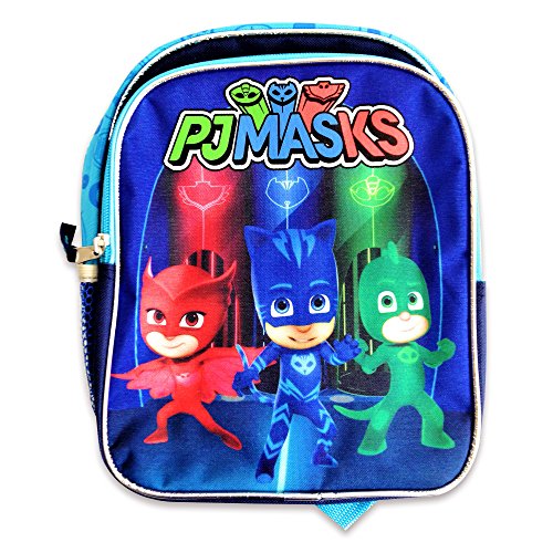 PJ Masks Backpack measures 10" high by 9" wide and is suitable for ages 3+. Features Catboy, Owlette, and Gekko. Backpack has main zippered compartment, a separate front zippered pocket, a padded back, padded side straps, and side mesh pockets.