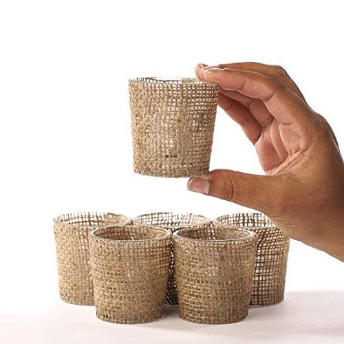 - Package of 6 Trendy Burlap Covered Glass Votive Candle Holders for Home and Party Decor
