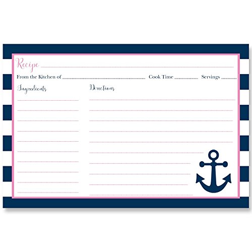Recipe Cards, Nautical, Bridal Shower, Housewarming, Wedding, Personal, Business, Stripes, Anchor, Nautica, Sea, Sailing, Navy Blue, Pink, 24 Back Printed Cards, Anchored in Love