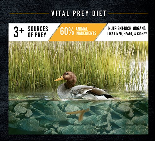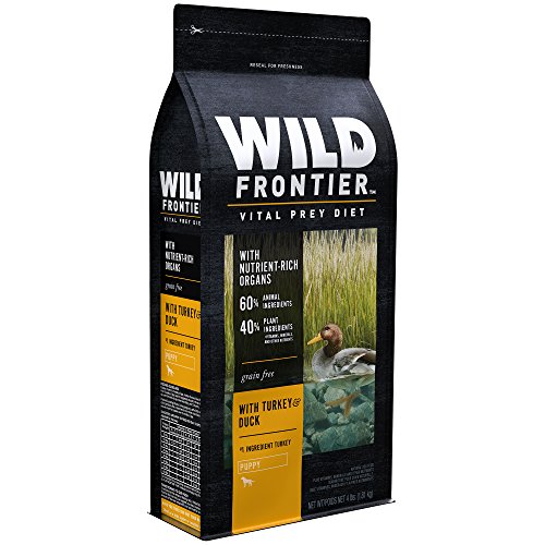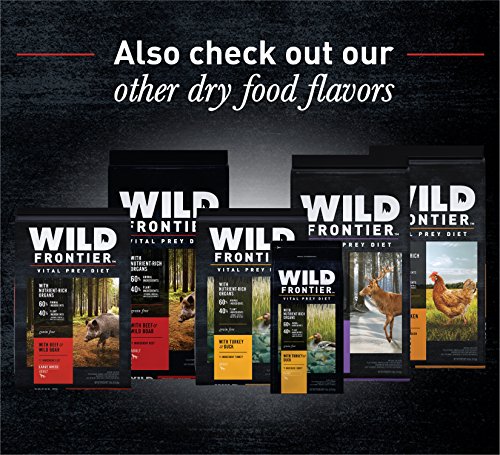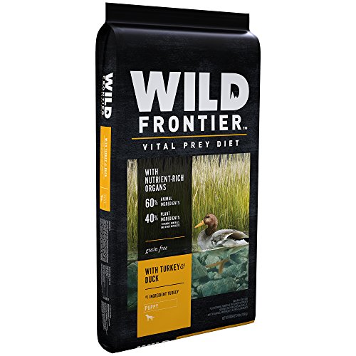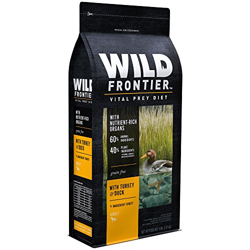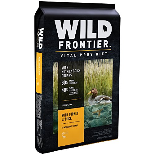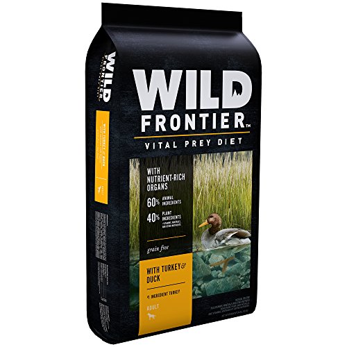 WILD FRONTIER VITAL PREY Dry Dog Food is made from protein-rich, animal-based recipes; this Turkey & Duck Dry Dog Kibble is made with 60% animal ingredients as part of a high protein, complete and balanced diet, designed to support strong, lean bodies. Plus, each dog food bag contains a variety of meaty proteins, including nutrient rich organs like liver, heart, and kidney. The VITAL PREY diets contain no corn, wheat, or soy protein, and are designed to support healthy digestion and healthy skin and coat. TRUE TO THE HUNT, WILD FRONTIER premium dry dog food is always meat first and grain free.Feature