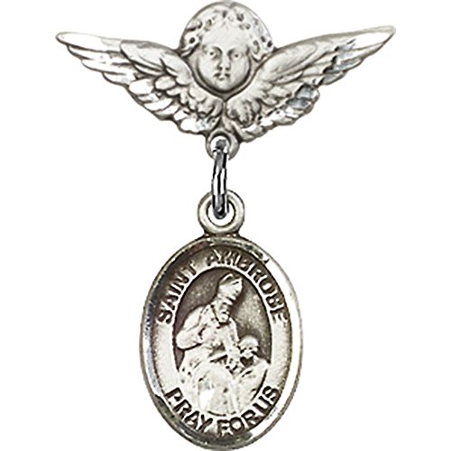 -. Title : Sterling Silver Baby Badge with St. Ambrose Charm and Angel w/Wings Badge Pin 7/8 X 3/4 inches
