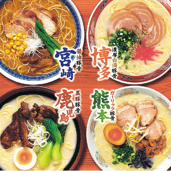 ●かん水を使用していない生麺をそのまま低温で48時間熟成乾燥させたこだわり麺。まるで生麺のようなのど越しと食感が特徴のこだわりの麺にじっくり煮込んだ白濁豚骨の博多、豚骨スープにガーリックの風味が効いた熊本、黒豚エキスを使用した鹿児島、醤油を入れあっさりとした醤油豚骨の宮崎と九州を代表する4県をイメージしたスープをセットしました。